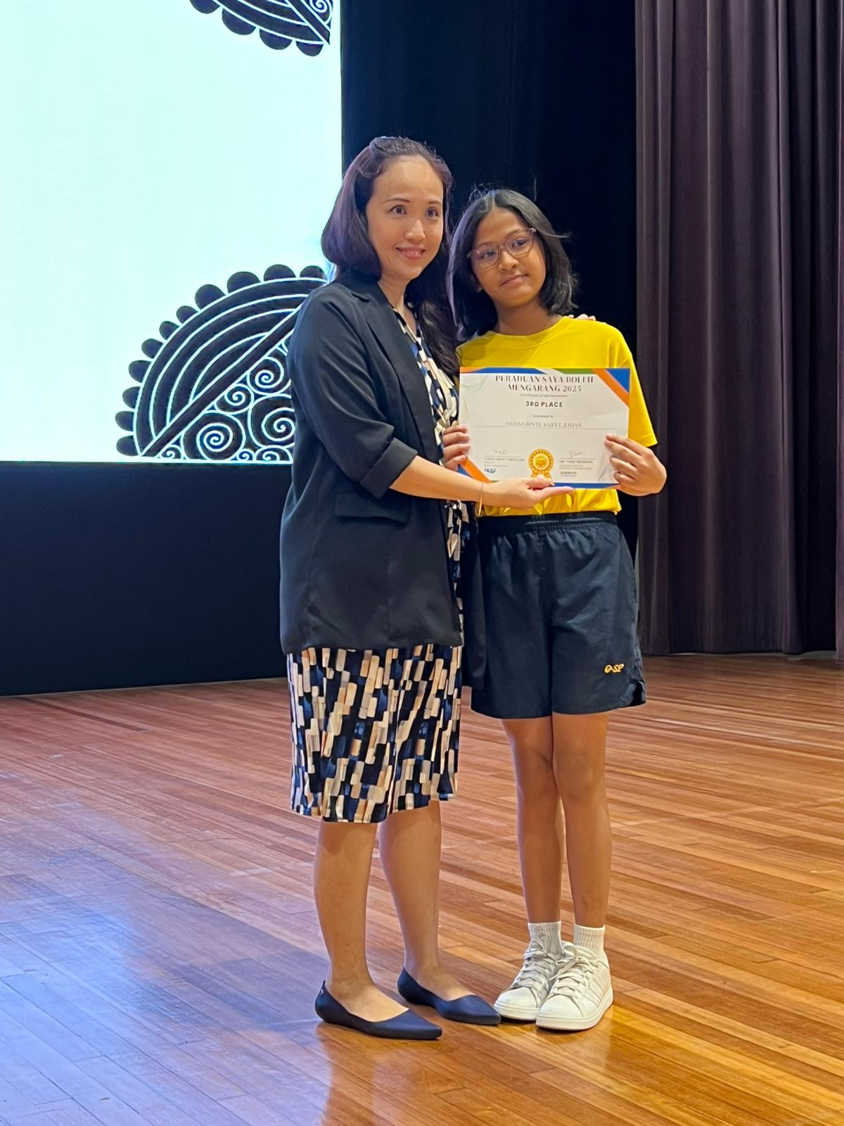 Among almost 60 entries from schools across the nation, Arissa Binte Saiful Johan from 6T, has achieved an amazing Third Place in the Final Round of the National Malay Writing Competition!